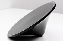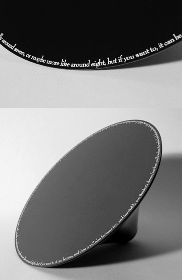 時間ってものを考えてみました。人間が生きるうえで切っても切り離せないもの。全ての人に平等に与えられる絶対的なもの。働く上で、時間と言うものは常に意識してしまうものですよね。何時に起きて、何時までに出社。何時に打合せがあって、何時までには成果を出す。とかくスピードが要求される今の世の中にあっては、時間に支配されているような気さえする程。そんなライフスタイルからの脱却に一役買ってくれそうなシロモノがコレ。”About Time” 読んで字の如くとはまさにこのことです。意味は分かるけど何コレ?と思われるかもしれませんが、実はこれ時計なんです。時計なのに数字が一つもない。針すらもない。じゃあ何があるのかとよく見てみると、円を縁取るように並んだ英文字。実はこれ、時間を説明する文が円を一周してるんです。しかもその内容といったらなんともアバウト。書いてある英文をアバウトに訳してみるとこんな感じです。「う〜ん、大体7時くらいかな・・・、それか、たぶん8時っぽいような・・・いや、もし君が望むのであれば9時とも言えるし・・・・・」といった具合。 あ、でも、時計としての機能はアバウトながら果たしているのでご安心を。直径20cmの”こま”のような形が一定の速度でぐるぐるぐるぐる回ります。で、円と机の表面に触れる所の言葉が時間を表しています。机の上で黒い物体が、動いているのか、止まっているのかも分からないようなスピードで回転する様はなんとも不思議な光景。まるで詩のように優美な動きがあなたの時間感覚にゆとりを与えます。 この”About Time”は、日常生活を分刻みに計画される傾向のある現代社会に対するメッセージ性をはらんでおり、私たちのストレスフルな生活を危惧してデザインされたものです。 仕事をするあなたの視界で、瞑想的にさえ感じる動きによりあなたはリラックスし、きっと時間すらも忘れられることでしょう。