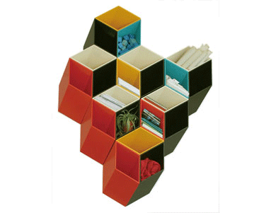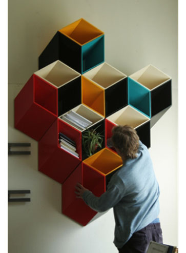 Art piece? Functional furniture? This piece does both with panache. And since you are staring into space anyways, might as well challenge ye old brain to think in more than 2D with this awesome bookcase. Every time I look at it, I can’t help taking a second and third look. Sometimes a fourth and fifth look because it’s fascinating how a simple structure like this can continually play tricks with your eyesight. According to the designer, these shelves are supposed to simulate the way your mind stores language concept information. In other words, a simple word or shape has more meaning or depth than what is used to store them. One example that the designer uses is the word `cornfield` The word is simple but the concept you store in your memory is quite detailed. Just like these shelves, a simple form that provides hours of meditation material. [Text by Beverly Karhson]