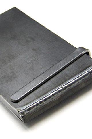 ひと目見て、この名刺ケースが何で出来ているのか、ピンときた方は少ないかもしれません。重厚でありながら素朴さを感じさせるこの素材。見慣れた姿とは大きく違いますが、実は鉄なんです。「黒皮」と呼ばれる、独特な質感を持つ表面の酸化皮膜は、鉄材が生成される過程で発生するもの。通常、製品に加工される時に塗装されたり剥離されたりしてしまうのですが、この素材感を最大限に生かしながらプロダクトにしてしまったのが、神戸に工房を構える鉄工所「ヤマナカ産業」さん。