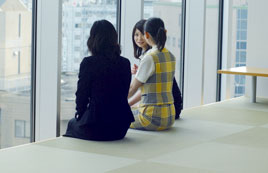 2つ目は、”自然な”心理の切り替え。社員は出勤すると必ず「リフレッシュルーム」を通過する構造になっている。「社長、ココに住んでいいですか?」とスタッフに言わしめるほどだ。このスペースの一角には畳が置かれ、8階という景観を十分に堪能できる開放的なレイアウト。その後、併設された更衣室で着替えワークスペースへ向かう。社員はこの一連の移動で遠藤社長の言う「ON/OFFが明確なオフィス」を無意識のうちに感じることになる。さらにワークスペースへ入ると最初に、壁面にある自分のプレートを反転させる。通常は名前が記載されているプレートを連想するが、同社のプレートは自分の満面の笑みがプリントされている。「自分の笑顔を見て、自分が笑う。その笑顔がお客様に伝わると、そのお客様はきっと担当したカスタマーフレンドの、商品の、会社のファンになっていただける。このアナログ的なプレートシステムは凄く気に入っています」と遠藤社長は語る。