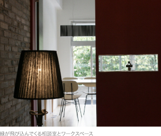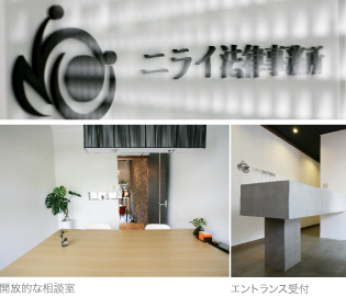弁護士事務所と聞いて、まずはじめに何を想像するだろうか。天井高く積み上げられた判例資料の山?それとも高級感たっぷりの応接室?沖縄の東の海の彼方にあるとされる理想郷「ニライカナイ」を由来とする「ニライ法律事務所」は、そんな既成の法律事務所のイメージを払拭させるオフィスだ。所属弁護士の仲西弁護士は、「私達は、仕事場を単に作業できる場所とは捉えていません。目に見える機能性だけでなく、家や車、趣味の物に凝ったりするのと同じように、自分達の居場所としてオフィスにもこだわりを持っていたいと考えています。」その言葉の通り、オフィス内の随所にそのこだわりが窺える。エントランスにはシャンデリアがかかり、相談室まで続くレンガの壁に目を奪われる。相談室は、執務室から完全に区切られた防音のスペースでありながら、大きな窓と随所に配置された観葉植物が空間に開放感を与えている。また、ニライ法律事務所の相談室には電話機を設置していない。事務的なイメージを排除し、何よりも依頼主との信頼関係を重んじる仲西弁護士の意向からだ。さらに相談室へは、靴を脱いで入室する形を取っている。「私達にとっても依頼主の方にとってもリラックスしてお話でき、大変良い効果を生んでいると思います。」また普段使っているボールペンは琉球松を素材としたものだったり、お茶を出すカップはコーポレートカラーである赤色の琉球ガラスだったりと、事務所と言うよりも、リラックスできるお気に入りのカフェに来たという感じかもしれない。法律事務所に求められるクローズな空間を基本としながらも、オープンなおもてなしでお迎えする。そんな仲西弁護士や古賀弁護士の細やかな心配りが感じられる、今までにあるようでなかったオフィスではないだろうか。