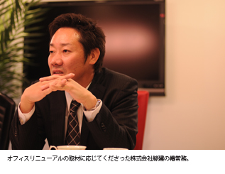 ロゴマークは会社の顔だと思う。自分の名刺や会社のホームページ、封筒やノベルティにいたるまで、不特定多数の視線に触れる可能性のあるロゴは、自社への帰属意識を喚起させると同時に、「どんな会社なんだろう?」「何を考えている会社なんだろう?」と、お客様にワクワク感や信頼感、安心感をもたらす。綜建ではオフィスの改装と同時に自社のロゴマークも一新した。もともとは工事用のヘルメットにのみ付けられていたが、自社のブランディングという意味で今回新たに作られる事となったのだ。内装業者では珍しいスタイリッシュなロゴは、これまでの綜建の歴史を踏襲して以前使用していた「Sロゴ」をモチーフにしている。自身でもデザインを考えるほど、ロゴマークに強いこだわりを持つ椿常務だが、いくつか上がってきたプランを社員全員での投票で最終的に決定したところは、会社を家と見立てている綜建らしさが伺える。最後に伺った「これからの展望について」という問いに対して、「会社の物理的な成長よりも社員各自の内面的な成長を一番に挙げ、それによって会社全体の成長に繋げたい」とのこと。社員に対して一生懸命向き合っている会社は、きっとお客様とも良い信頼関係が築ける会社なのだろうと確信した。