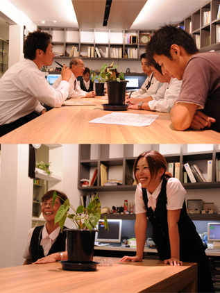 福岡空港近くに構えたオフィスが創業以来35年、始めて改装されることとなった。改装にあたり一番の要望はオフィス内に、社員全員と仕事上関係がある職人達が一同に集まって会議が出来るスペースが欲しいという事。新オフィスには大きな木製のテーブルが2つ、オフィススペースの中央に置かれ、普段はそこで昼食をとったり、打合せをしたり、作業スペースになったりと、自然に人が集まるスポットとなっている。もう一つの大きな要望は壁面収納。仕事で使う大量の建材や資材のサンプルをスッキリ収納する為に造った壁面収納は、必要な時にすぐに取り出せるだけでなく空間のアクセントにもなっている。また、間接照明と併せて個人デスク用の手元照明を付ける等、光環境の充実にも力が注がれ、見た目の美しさだけではなく使い勝手の良さも考慮されている。内装業者で自社のオフィスに力を入れている会社は珍しいのではないだろうか。少なくとも私はここまでスタイリッシュな内装業者のオフィスに出会ったのは初めてだった。それは自社のオフィスを改装する事で、社員のモチベーションを高める社内的な効果に加えて、社外的にもモデルオフィスとしてのメリットを狙っているからだと話してくれた椿常務。オフィスを考える上で働く環境も当然重要だが、オフィスを外部に向けてのアピールの場として捉えてみる。その考え方にオフィスリニューアルに含まれる大きなポテンシャルを感じた。